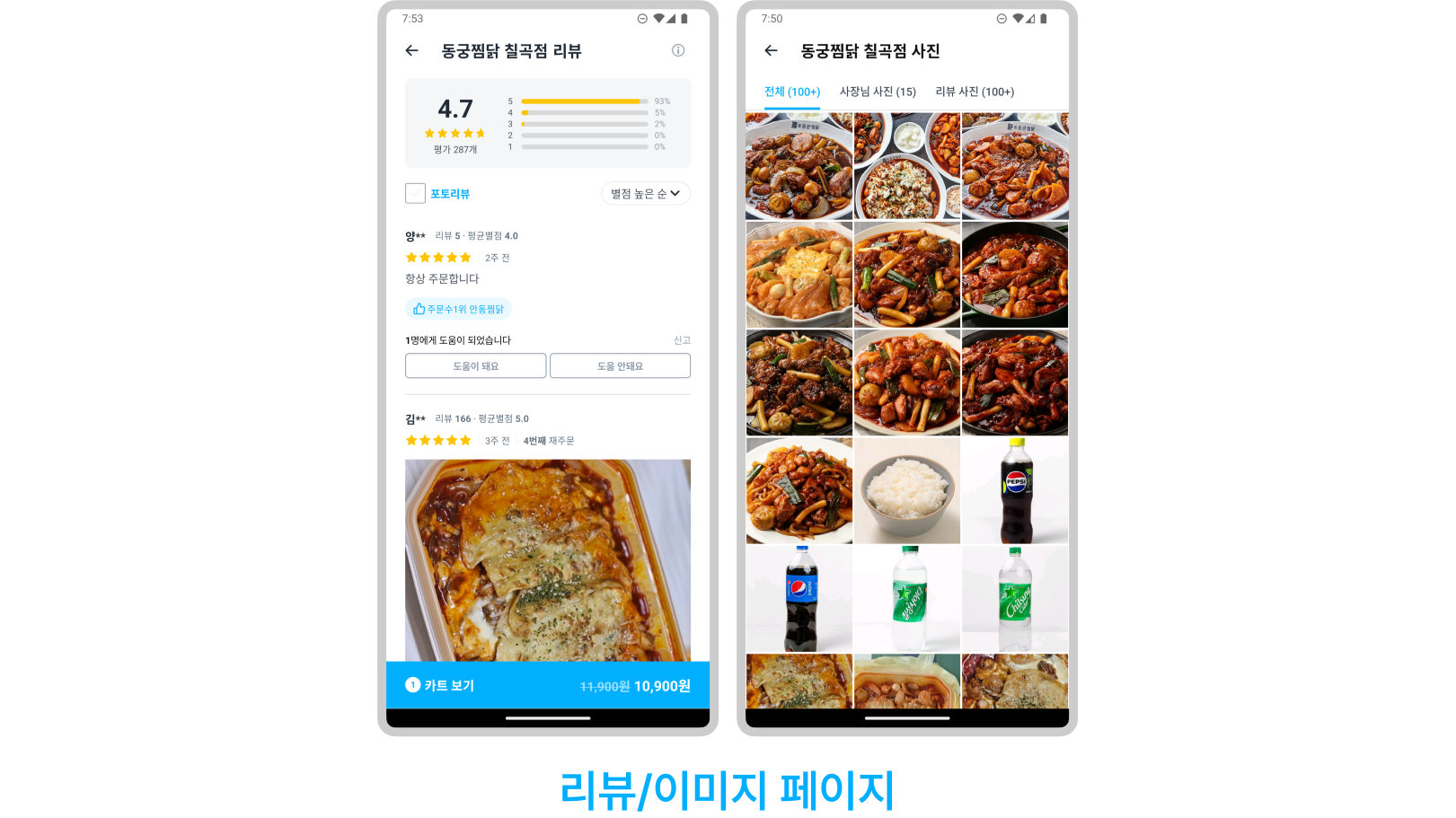 리뷰 / 이미지 페이지 : 리뷰 페이지에서 사용자 리뷰를 확인할 수 있습니다. 또한 이미지만 모아 볼 수 있는 갤러리 뷰를 제공해 가게측의 사진과 리뷰의 이미지를 비교해 볼 수 있습니다.