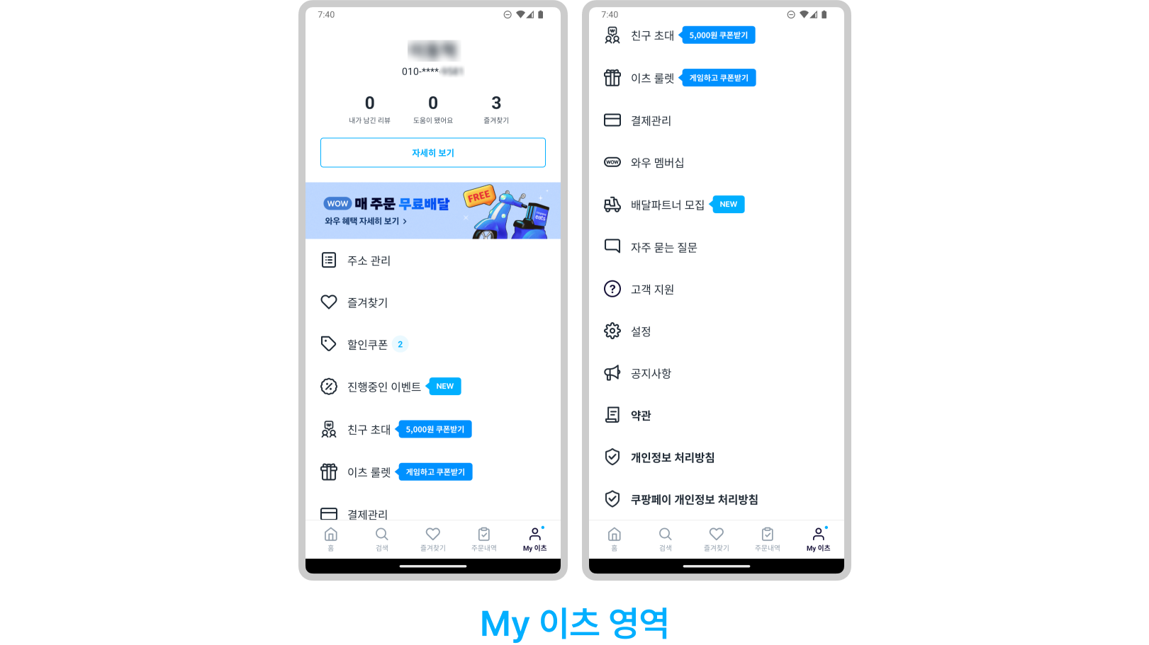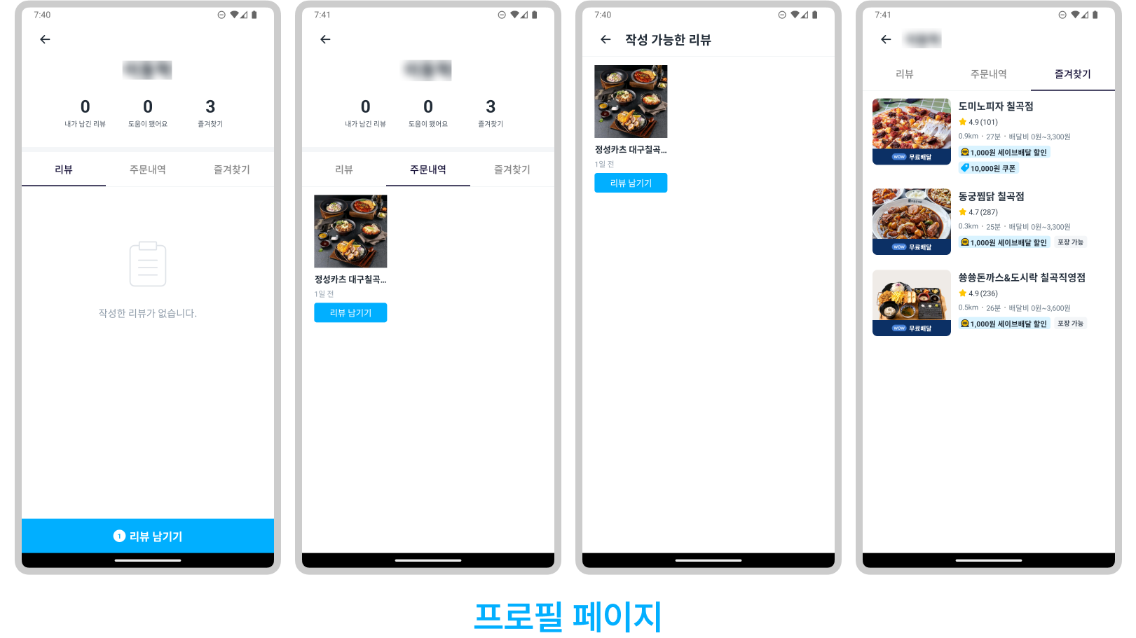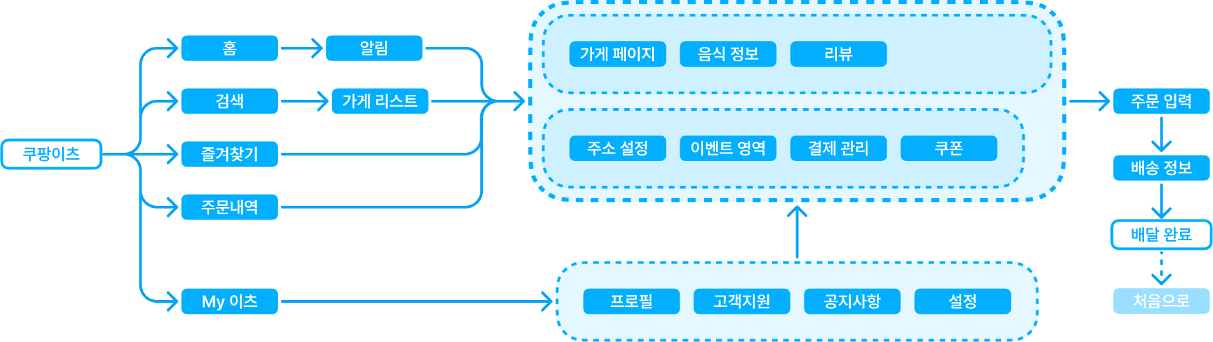 프로필 페이지 : My 이츠에서 접근 가능한 영역으로 자신의 활동 내역을 카운트해 보여주며 리뷰, 주문내역, 즐겨찾기 영역을 제공하고 있습니다.쿠팡이츠는 사용자 여정에서 불필요한 과정을 최소화하기 위해 전통적인 수직적 구조를 탈피하고, 일부 화면에 컴포넌트 기반의 페이지 구조를 도입했습니다. 이를 통해 사용자는 특정 페이지를 벗어난 후에도 이전 작업 지점으로 쉽게 돌아갈 수 있습니다.