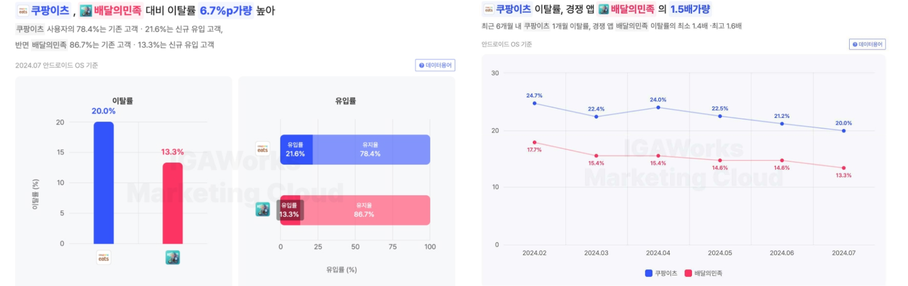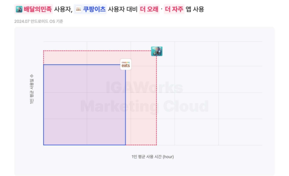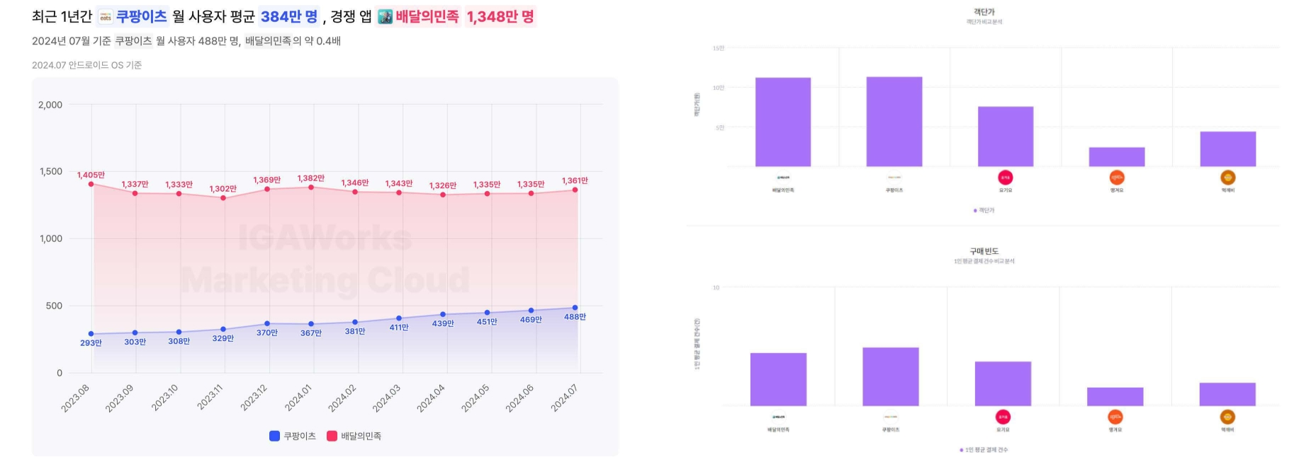 고객 데이터를 통해 쿠팡이츠는 배달앱 고관여 사용자를 주요 타겟층으로 설정하고 있음을 알 수 있습니다. 쿠팡이츠의 사용자들은 여러 배달앱을 함께 사용하는 유저들의 비중이 높으며, 이중 배달의민족 사용자의 유입이 많았습니다.