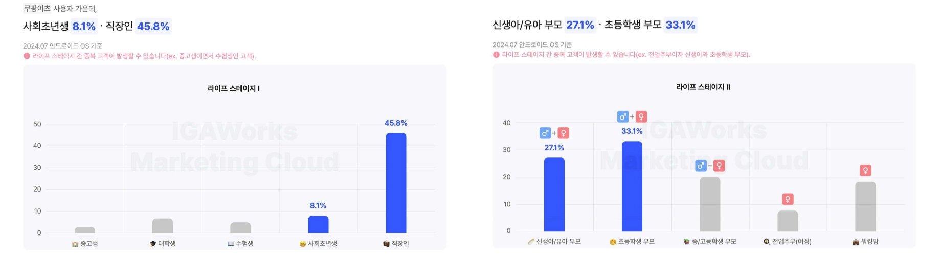 연령 및 라이프스테이지: 쿠팡이츠 사용자는 중고등학생부터 직장인까지 다양한 연령대와 라이프스테이지에 걸쳐 있습니다 특히 30대와 40대가 주를 이루며, 배달에 지출 비중이 높은 사용자군을 이루고 있습니다.