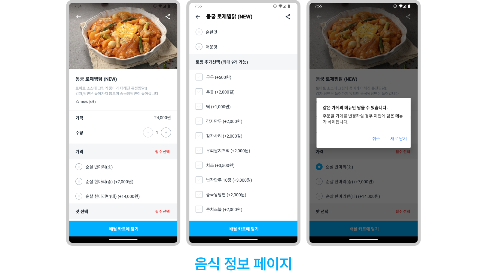 음식 정보 페이지 : 음식 주문시 필요한 정보를 입력하는 페이지 입니다. 배달 카트에 담기 선택 시 필수 선택 항목이 모두 선택되지 않았다면, 해당 항목으로 스크롤해 다시 선택하도록 만들었습니다. 만약 배달 카트에 다른 가게의 음식이 담겨 있다면, 알림 팝업을 표시하며 해당 내용을 고지합니다.앱 사용 마지막 단계로, 하단의 카트 CTA를 눌러 진입 가능합니다.