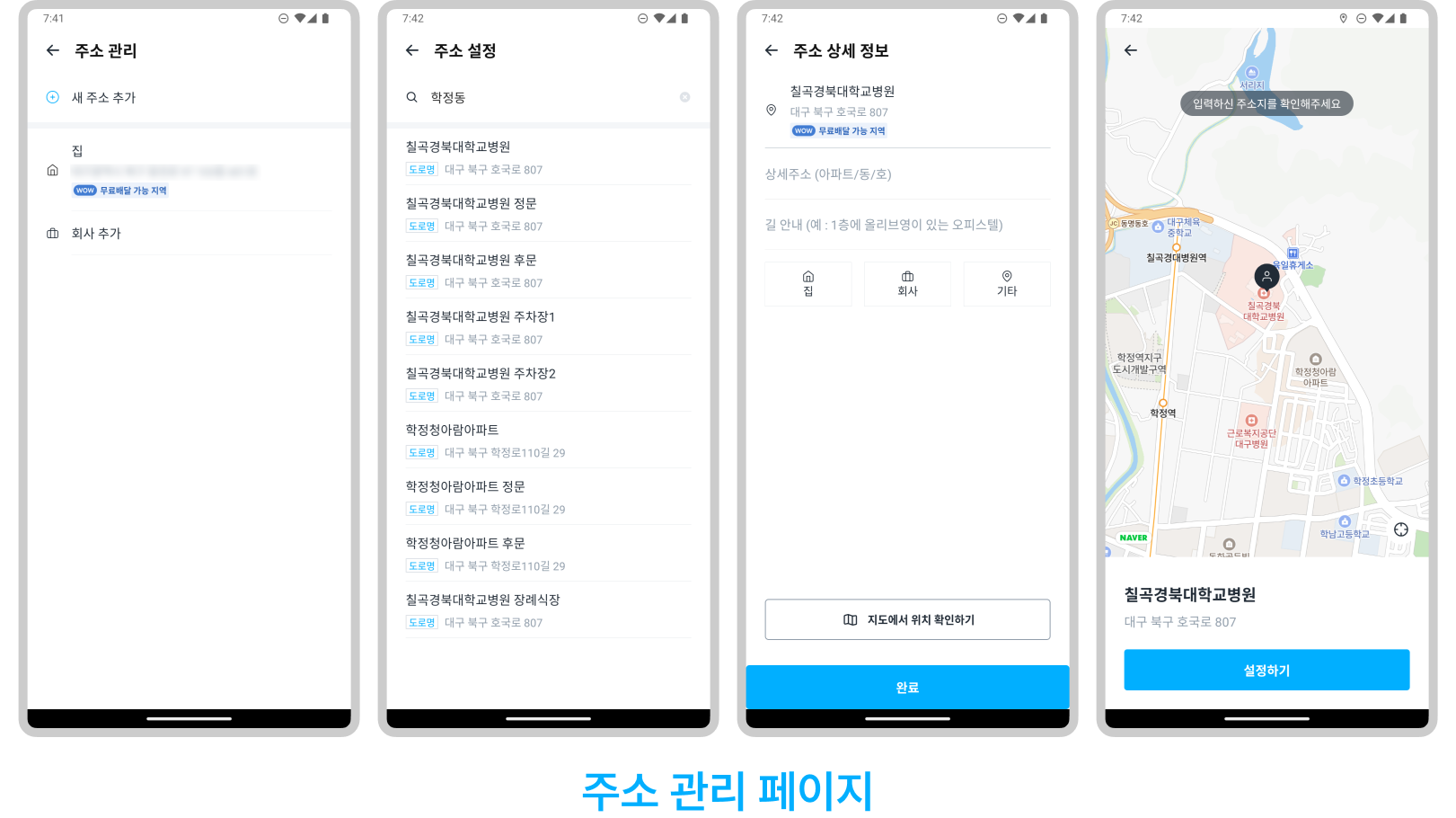 주소 관리 페이지 : 배송지를 관리할 수 있는 영역입니다. 상세 주소와 배달원이 찾기 어려운 길을 설명할 수 있는 안내 메시지를 입력할 수 있습니다. 도로명 주소를 사용하지만 지번 주소로도 검색이 가능합니다. 지도를 보고 위치를 선택할 수 있어 직관적 사용 경험을 돕습니다.