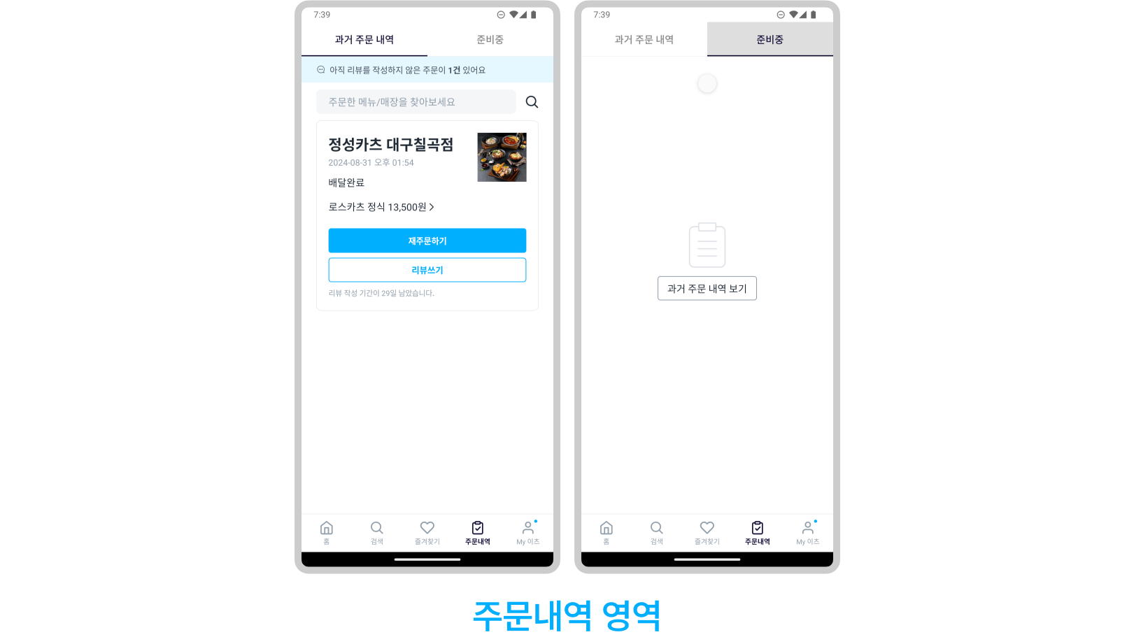 주문내역 영역 : 과거 주문 내역을 영업 중인 가게와 영업 준비중인 가게로 나눠 표시합니다. 이전에 주문했던 메뉴 그대로 재주문할 수 있는 기능을 제공하고 있습니다.
