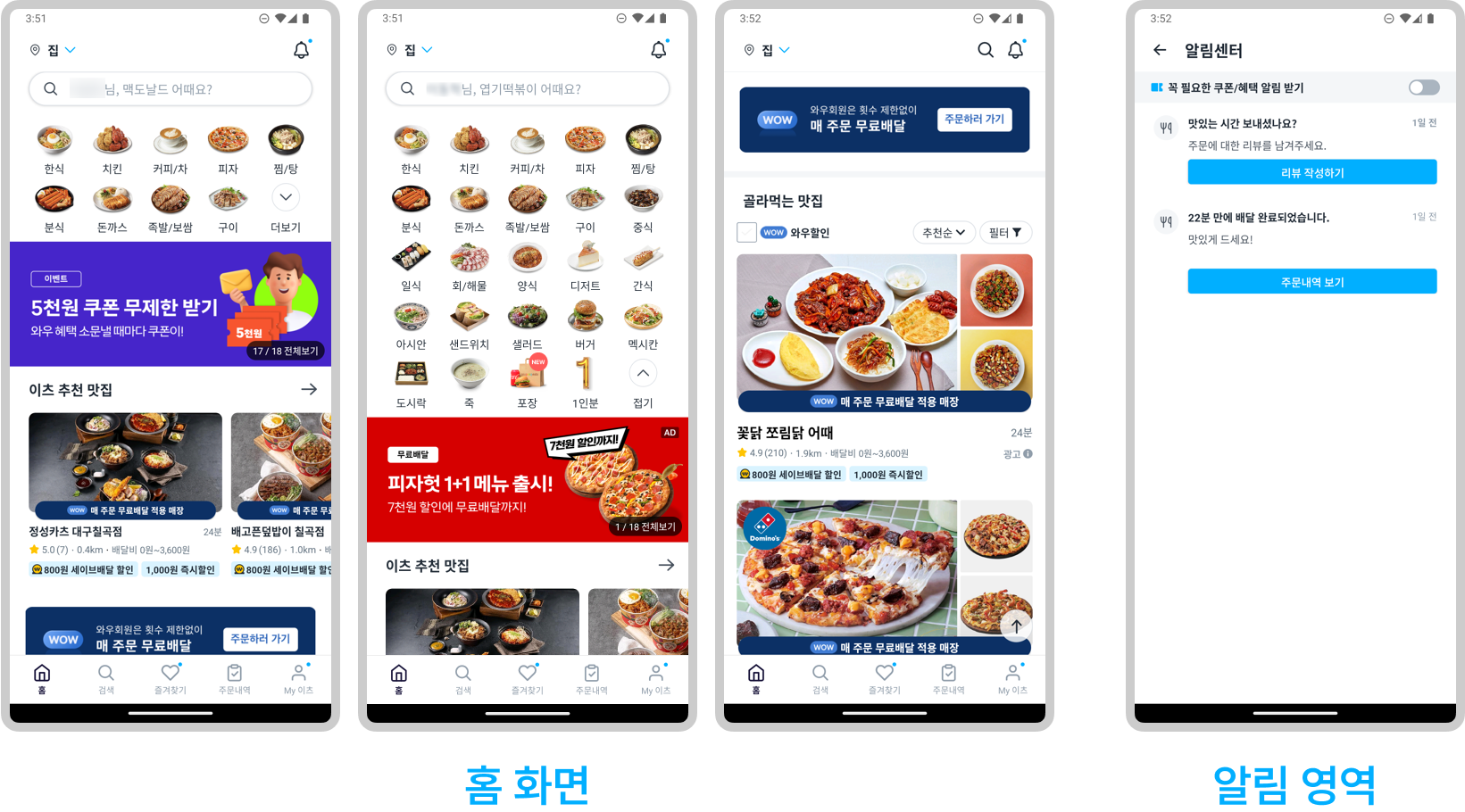 쿠팡이츠의 화면은 다른 국내 배달앱과 유사한 구조를 보여줍니다. 그렇다면 어떻게 사용성 차이를 만드는지, 무엇이 다른지 디테일의 차이를 쿠팡이츠의 화면 구조를 살펴보며 알아보겠습니다.