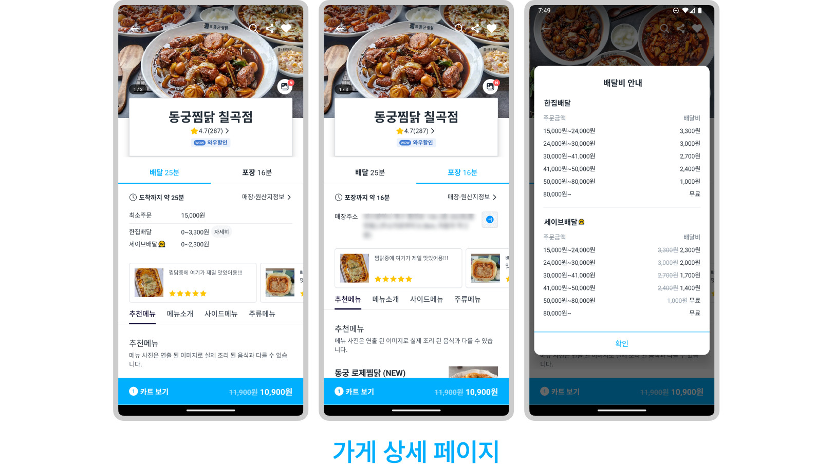 가게 상세 페이지 : 가게의 정보를 안내하고 메뉴를 주문하는 페이지. 배달과 포장 시 예상 시간을 표기하며 배달앱의 기본적인 정보들을 표시합니다.