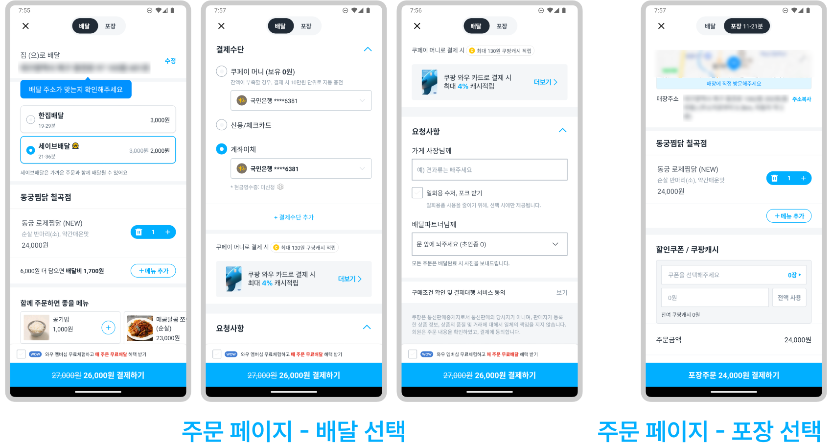 주문 페이지 - 배달 : 주문 목록을 확인하고 배송 방법과 결제 수단을 결정하는 화면입니다. 주문 완료 전, 추가 주문을 유도하는 추천 메뉴와 더 많은 혜택을 받을 수 있는 방법들을 안내합니다. 요청사항 처럼 옵션으로 제공되지 않는 세세한 요청을 전달할 수 있는 방법을 제공하고 있습니다.