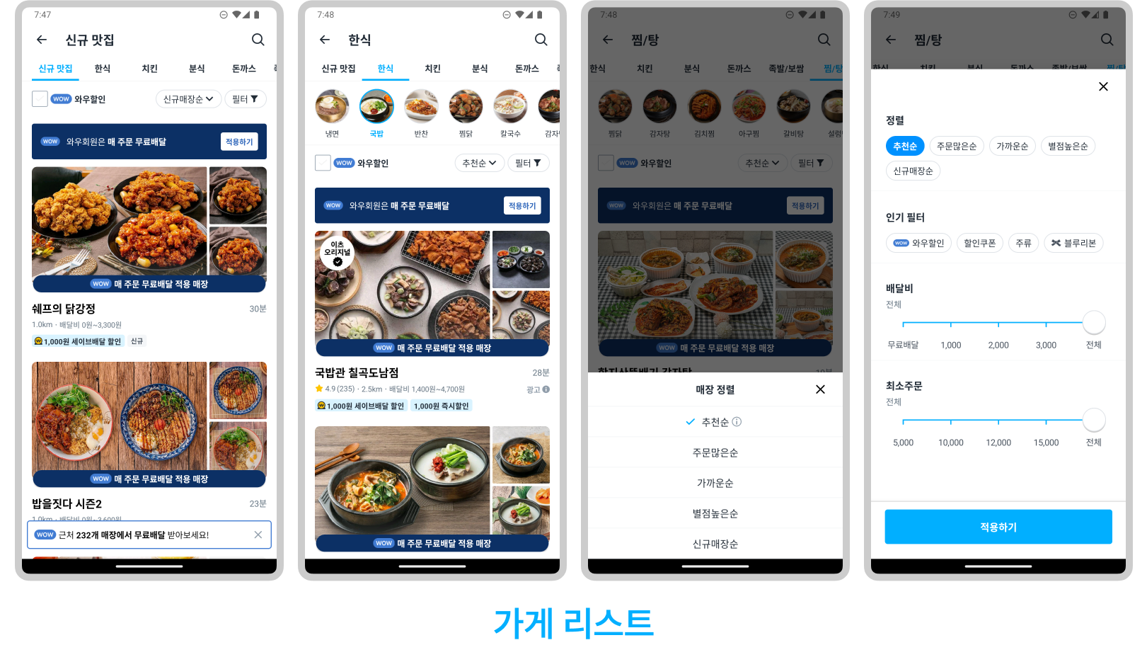 가게 리스트 : 위치 정보와 알고리즘을 활용해 각 카테고리에 맞는 음식점을 순서대로 나열합니다. 구체적인 필터를 제공해 사용자에게 조건이 좋은 가게를 찾을 수 있습니다.