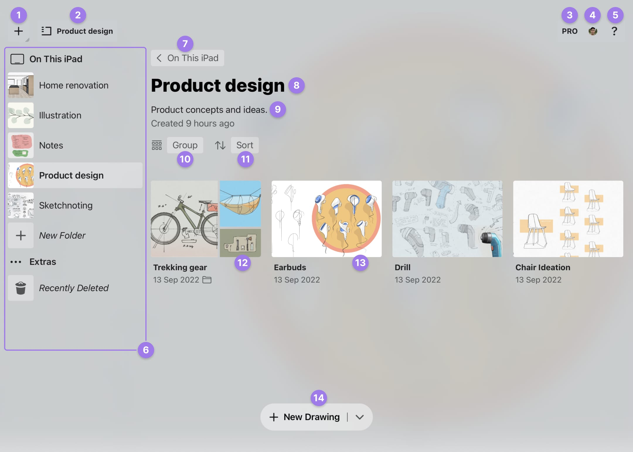 - 사이드바에 모든 그림들을 폴더 단위로 표시하여 탐색할 수 있습니다. 폴더를 탭하여 관리할 수 있으며 'New Folder'를 탭해 추가할 수 있습니다. 'Recently Deleted' 를 탭해 최근 삭제된 항목을 관리합니다.