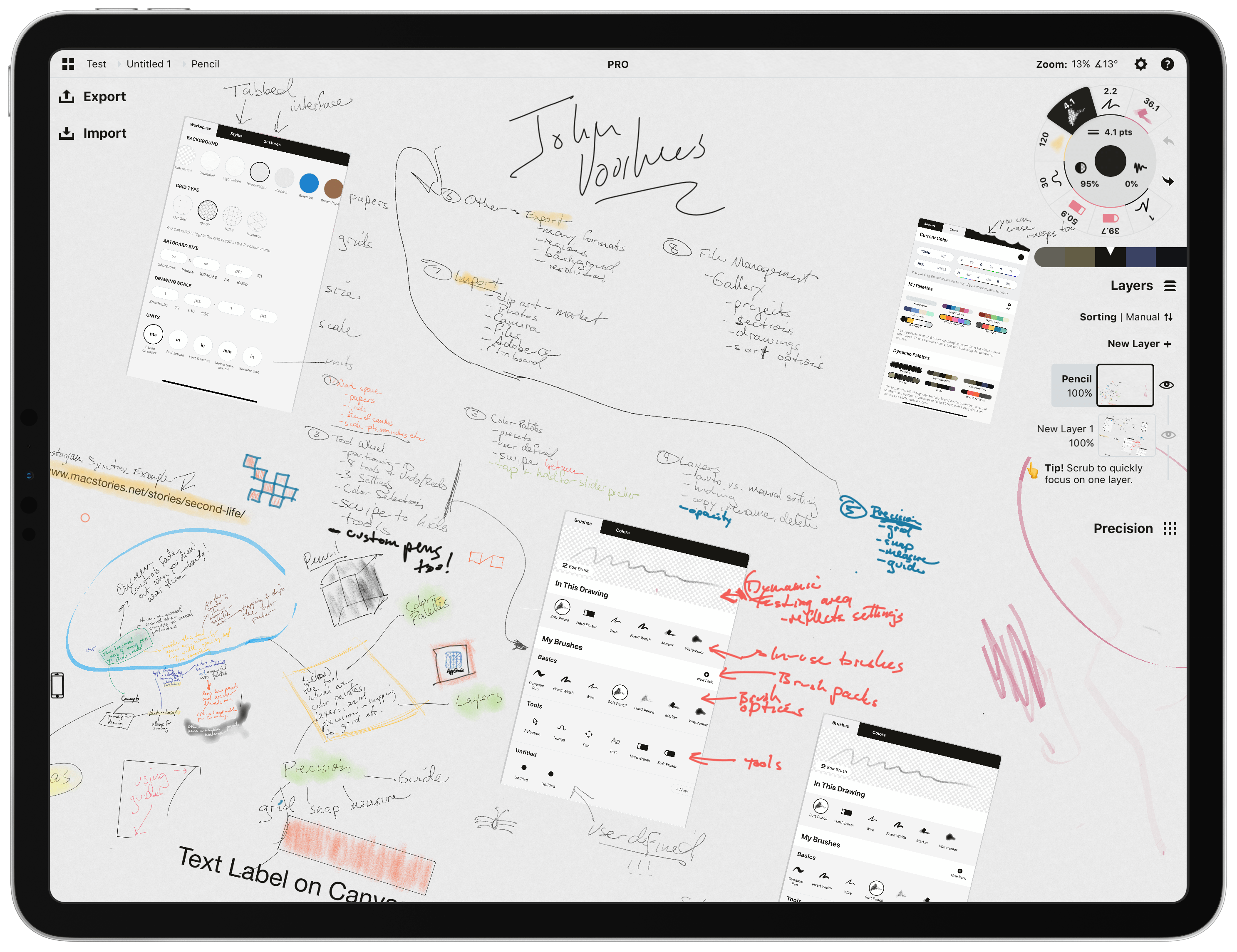 다른 드로잉 앱과 차별화되는 Concepts의 가장 큰 특징은 벡터 기반 드로잉 시스템입니다. 무한대로 확대해도 선명도가 유지되며 더욱 세세한 묘사가 가능합니다. 방대한 양의 간단한 스케치를 그리더라도 그린 요소들을 쉽게 편집하고 수정할 수 있습니다. SVG, DXF 등 다양한 벡터 형식의 내보내기를 지원해 다른 그래픽 도구와 자연스레 연동되는 워크플로우를 만들 수 있습니다.