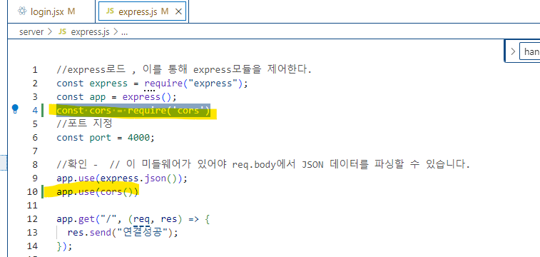 - CORS 정책 때문에 React앱(localhost:3000)에서 Express서버(localhost:4000)로 요청을 보낼 때 문제가 발생함. 브라우저 보안상 서로 다른 포트로 요청을 보낼 때,서버가 명시적으로 CORS 허용을 해줘야 함.