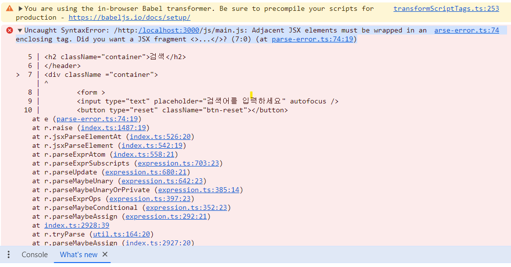parse-error.ts:74 Uncaught SyntaxError: /http:/localhost:3000/js/main.js: Adjacent JSX elements must be wrapped in an enclosing tag. Did you want a JSX fragment <>...</>? (7:0) (at parse-error.ts:74:19)