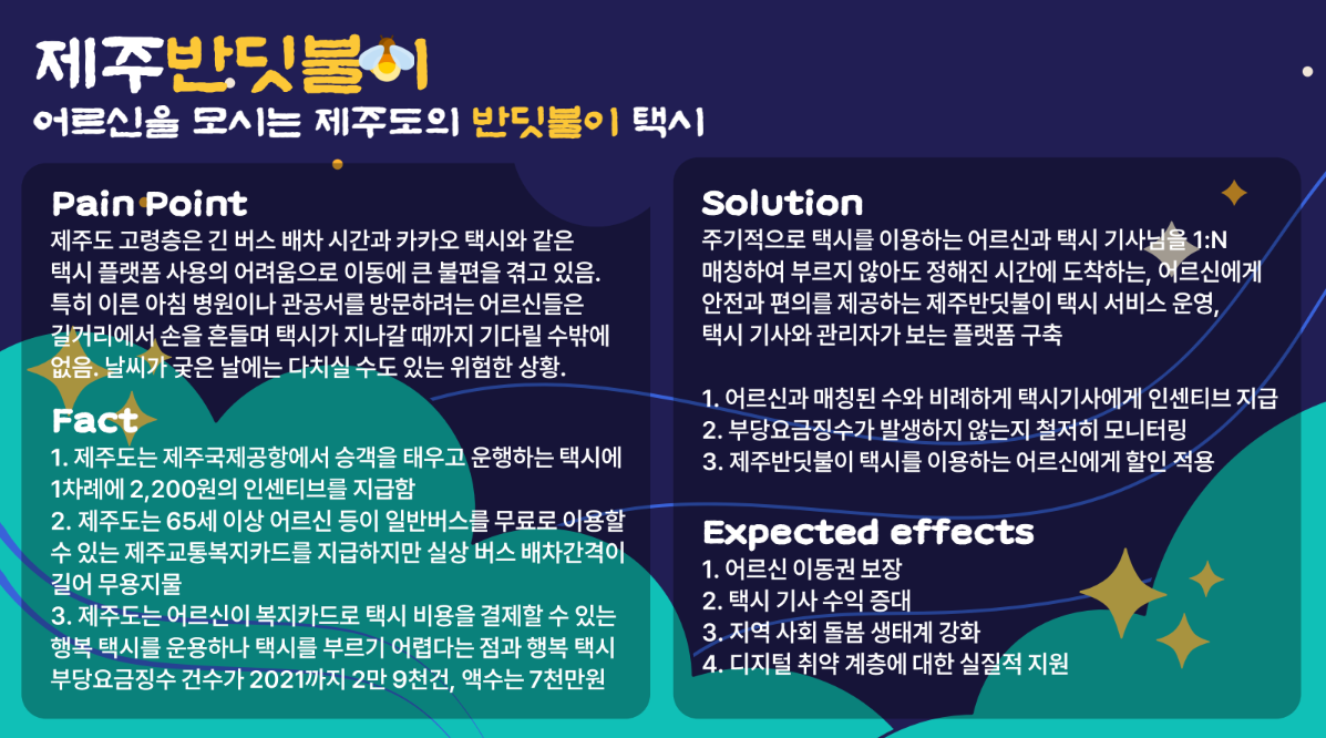 그래서 나는 택시 기사님께서 주신 아이디어와 사실들을 조합해서 제주반딧불이 서비스를 기획했다.