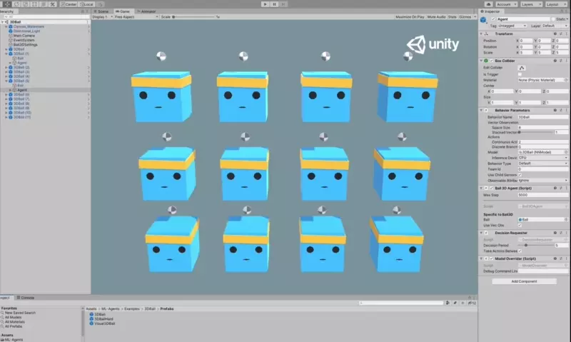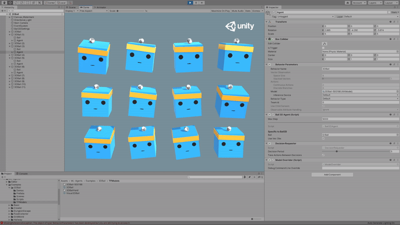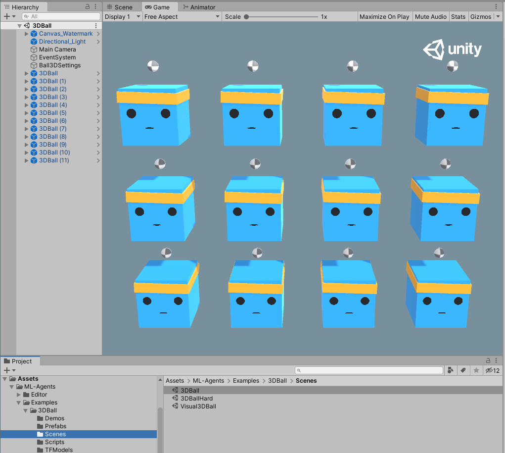 Assets/ML-Agents/Examples/3DBall/Scenes 폴더의 3DBall Scene을 열어봅시다