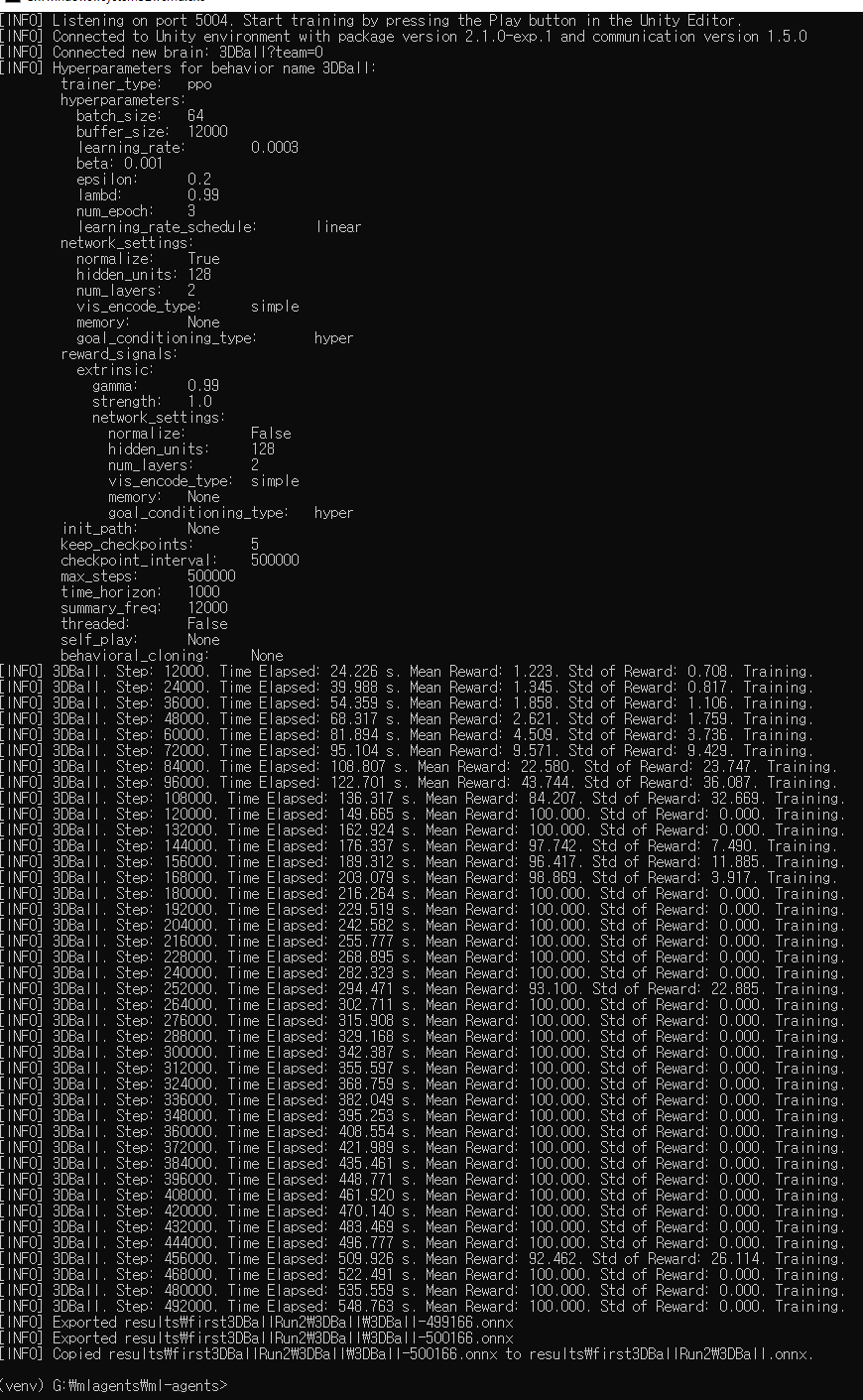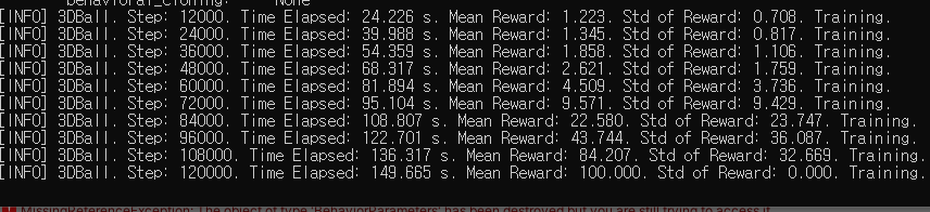 학습이 진행되는 [INFO]메시지에서 Mean Reward가 점진적으로 상향하는지를 살펴보라고 하네요.