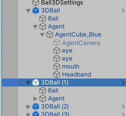 앞서 설명한 Agent에 대해 보다 더 깊이 이해하기 위해서는 Hierarchy 윈도우에서 하나의 3DBall을 확장해봅시다