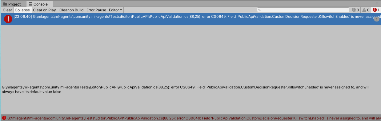 unity2019.4.5f1 Run ML-Agents Error:PublicApiValidation.cs(88,25): error CS0649