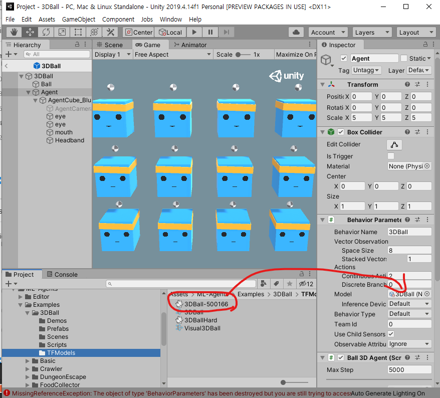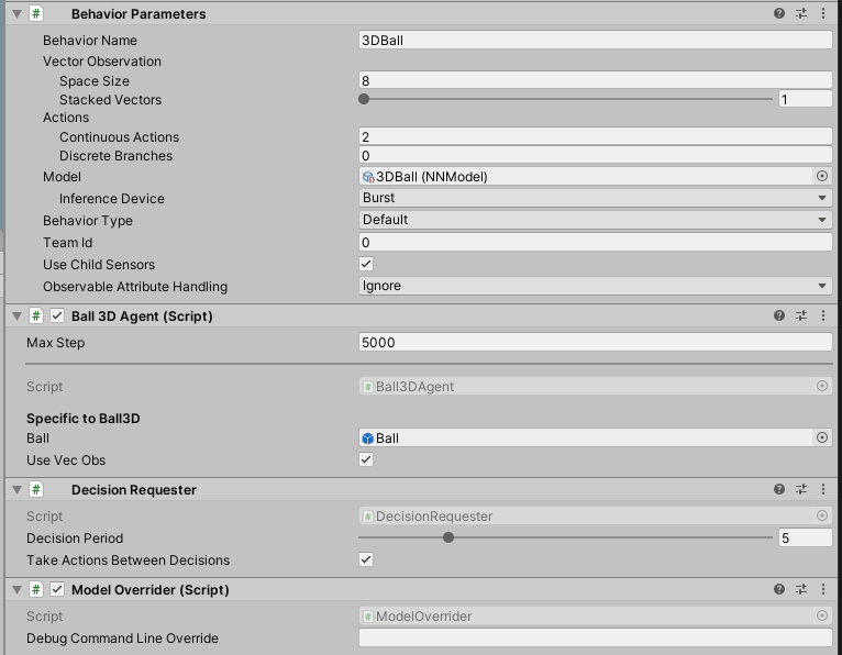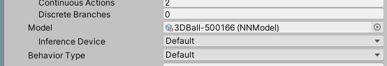 그후 아까와 비슷한 느낌으로 3DBall Prefab을 연 후, 하위 Agent의 Behavior Parameter의 Model항목에 학습된 모델을 드래그 앤 드롭하시면 우리의 모델이 세팅이 됩니다.