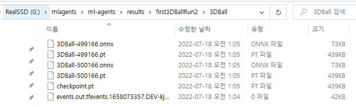 확장자 onnx 파일을 3DBall의 TFModels 경로로 복사해봅시다.