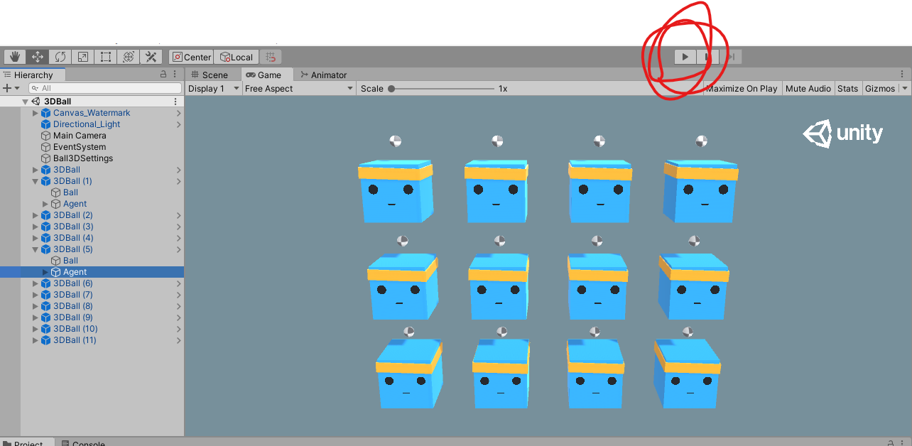When the message "Start training by pressing the Play button in the Unity Editor" is displayed on the screen, you can press the Play button in Unity to start training in the Editor.