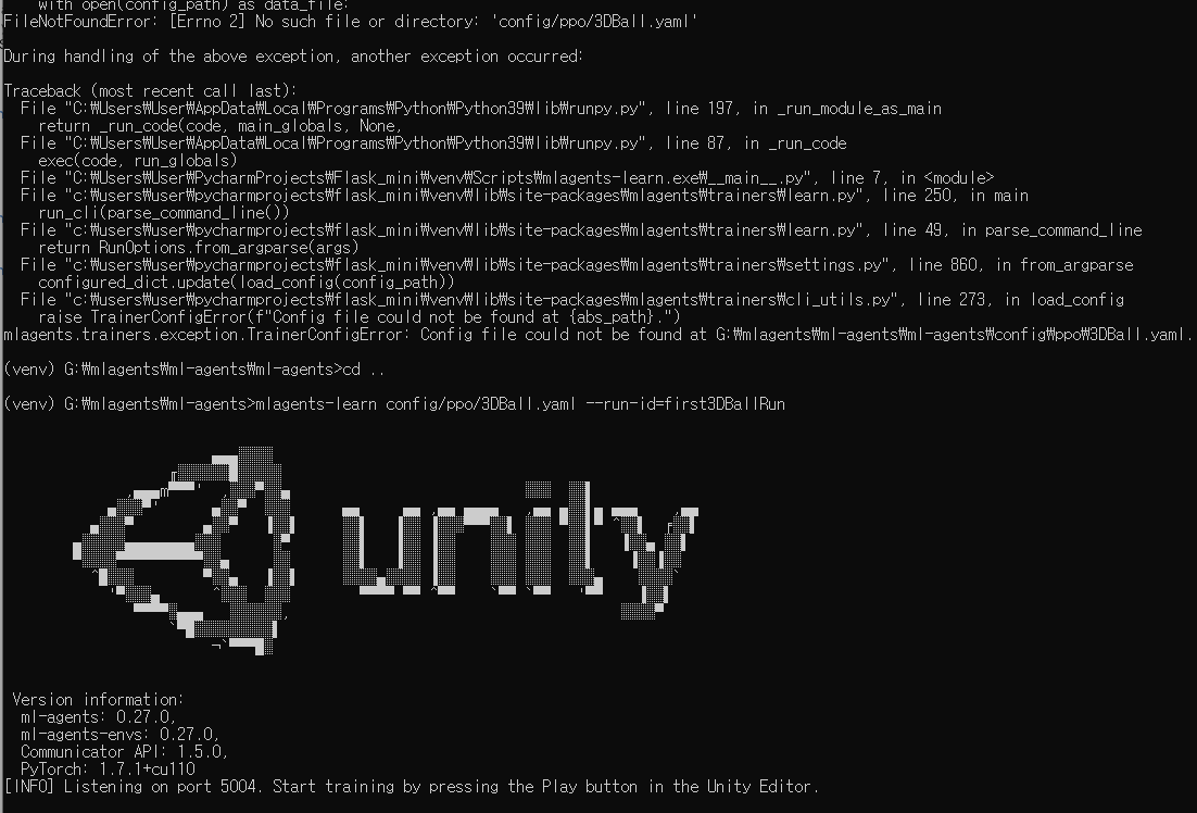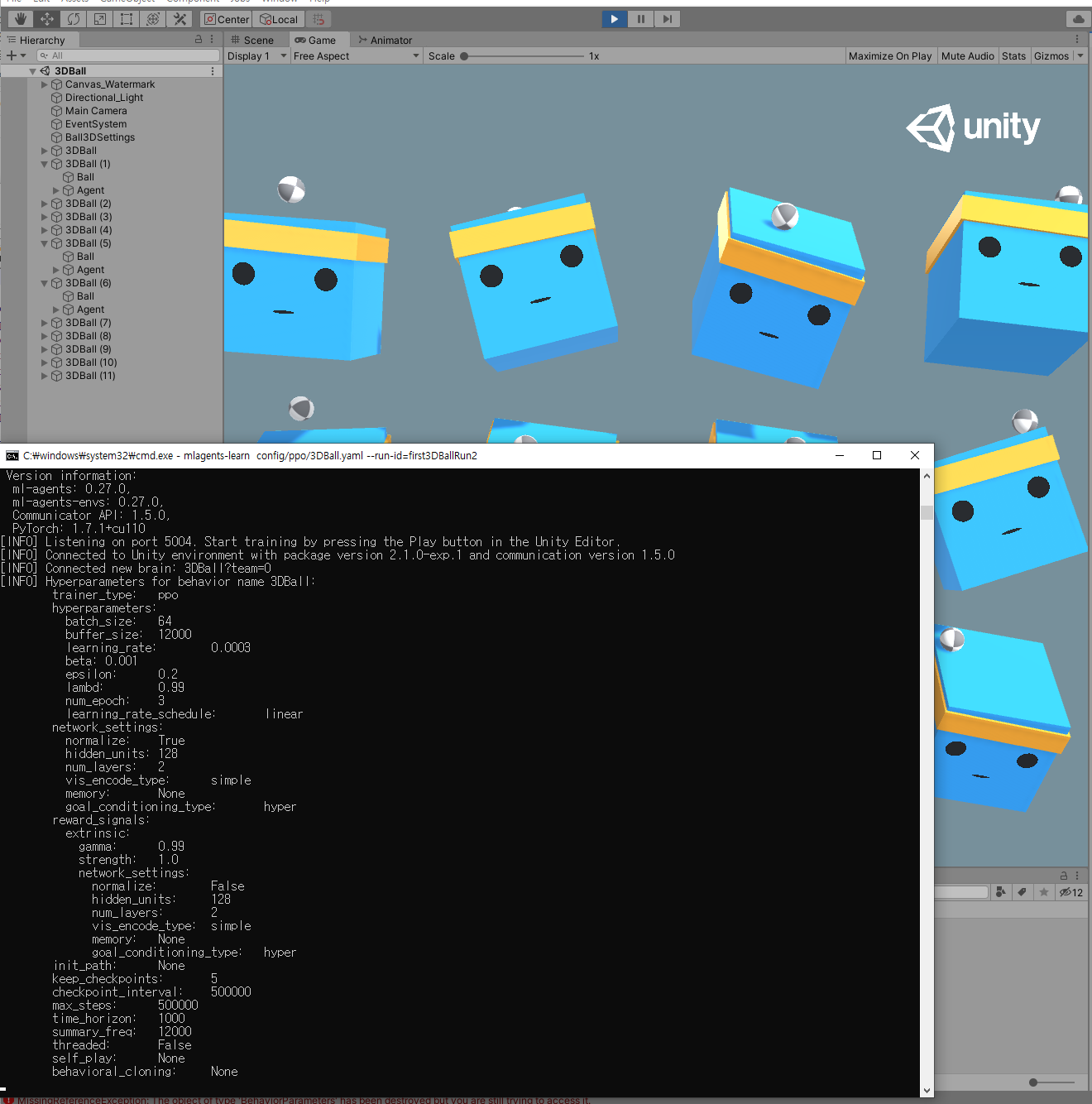우선 하란대로 mlagents-learn config/ppo/3DBall.yaml --run-id=first3DBallRun 명령어를 통해서 학습을 진행해봅시다.