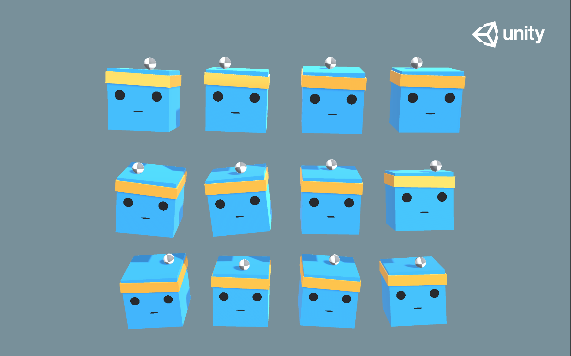 처음에 이 3D Ball을 열었을때, 12개의 상자가 눈에 들어올텐데요. 이 상자들은 게임에서 각각 독립적인 개체로 행동하지만, 12개의 상자들이 모두 같은 로직으로 행동합니다.