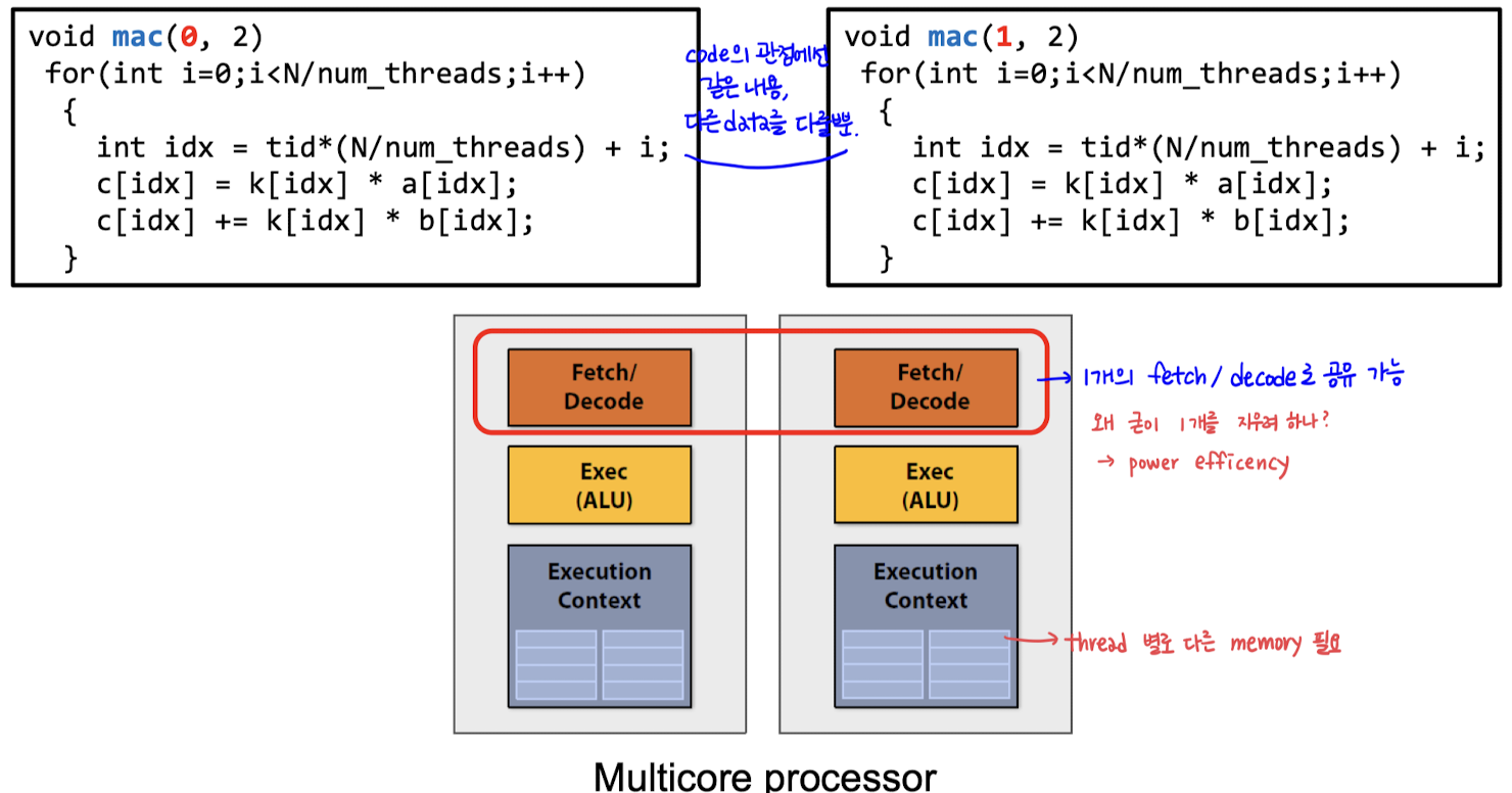 → 하나의 명령어가 다수의 연산장치(ALU)에서 동시에 실행되도록 : 병렬성 ↑, 연산량 효율적으로 처리