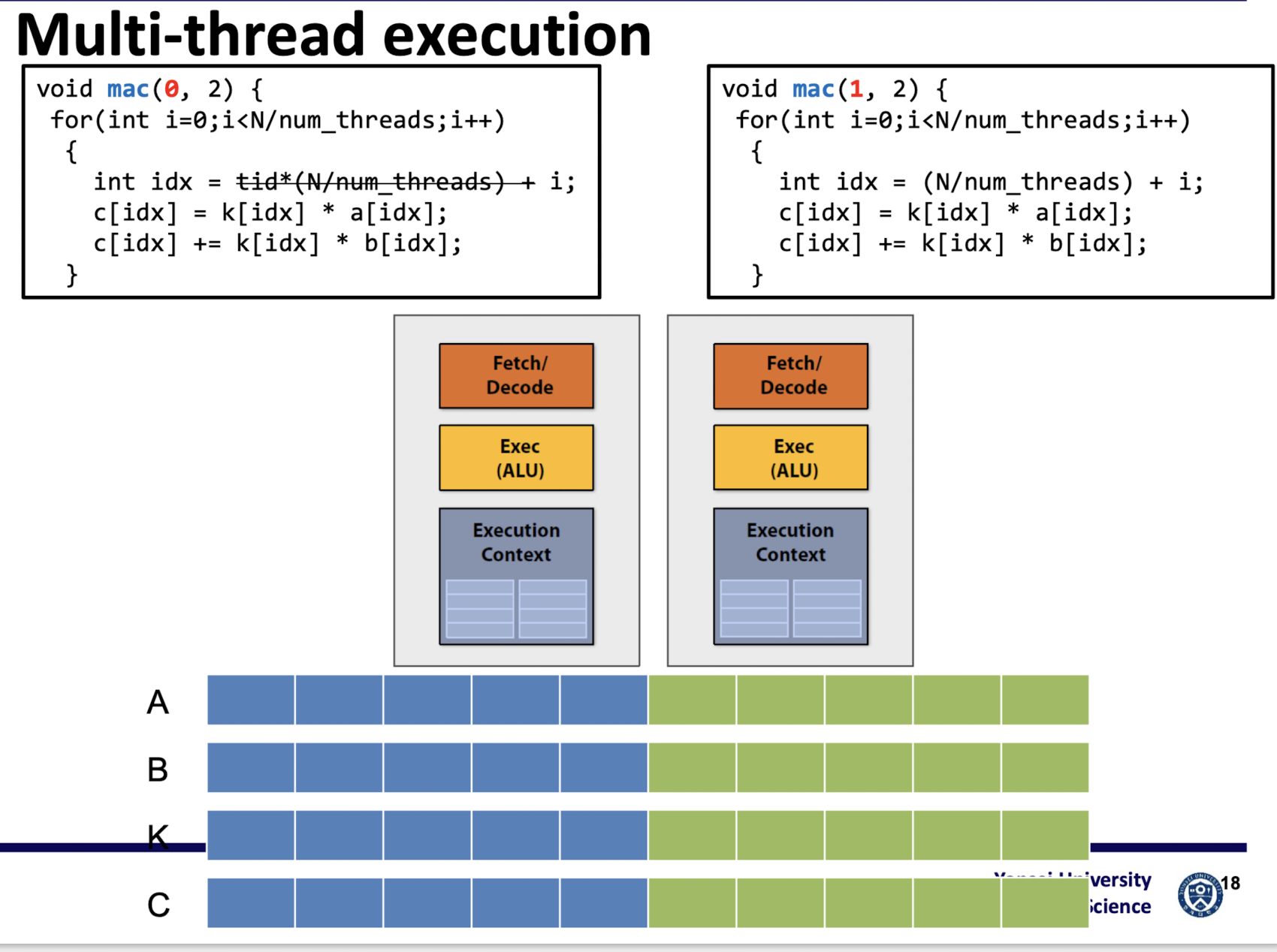 // 각 스레드는 mac 함수를 호출하며, 스레드의 인덱스(t)와 전체 스레드 수(NT)를 전달
