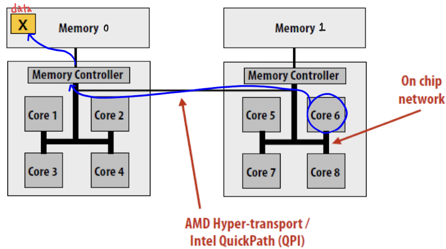 - local memory access (로컬 메모리에 접근) vs remote memory access (원격 메모리 접근) → 서로 다른 지연 시간을 가짐