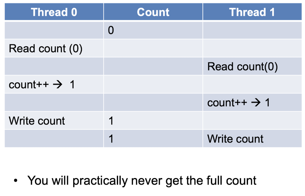 문제는 Read-Modify-Write 연산이 여러 thread에 의해 동시에 실행될 수 있고, 이들의 실행 순서가 보장되지 않는다는 것 ,,→ 하나의 thread가 Read 연산을 수행하는 동안, 다른 thread가 그 값을 Modify하거나 Write 연산을 수행할 수 있음