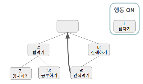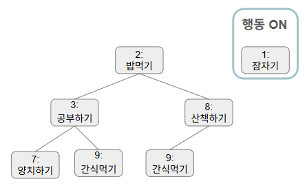 [(7:양치하기), (2:밥먹기), (9:간식먹기), (1:잠자기), (3: 공부하기), (13: 산책하기)