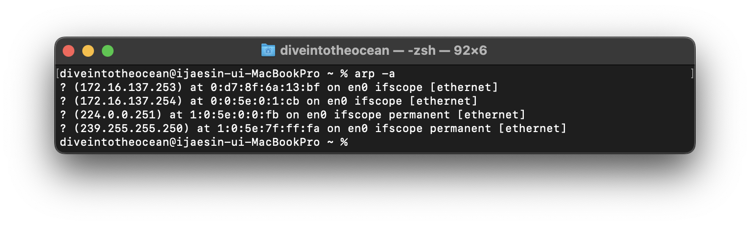 IP 어드레스만 알고 MAC 어드레스를 모를 때는 ARP 를 사용하면 돼요. 원활한 네트워크와 시간 효율을 위해, 한번 확인한 MAC 어드레스는 요청한 컴퓨터에서 일정 기간 보관하여 캐시 기능을 하게 되어 있어요. 만약 캐시에 보관된 MAC 어드레스의 목록을 확인하고 싶다면 arp 명령으로 확인할 수 있어요.