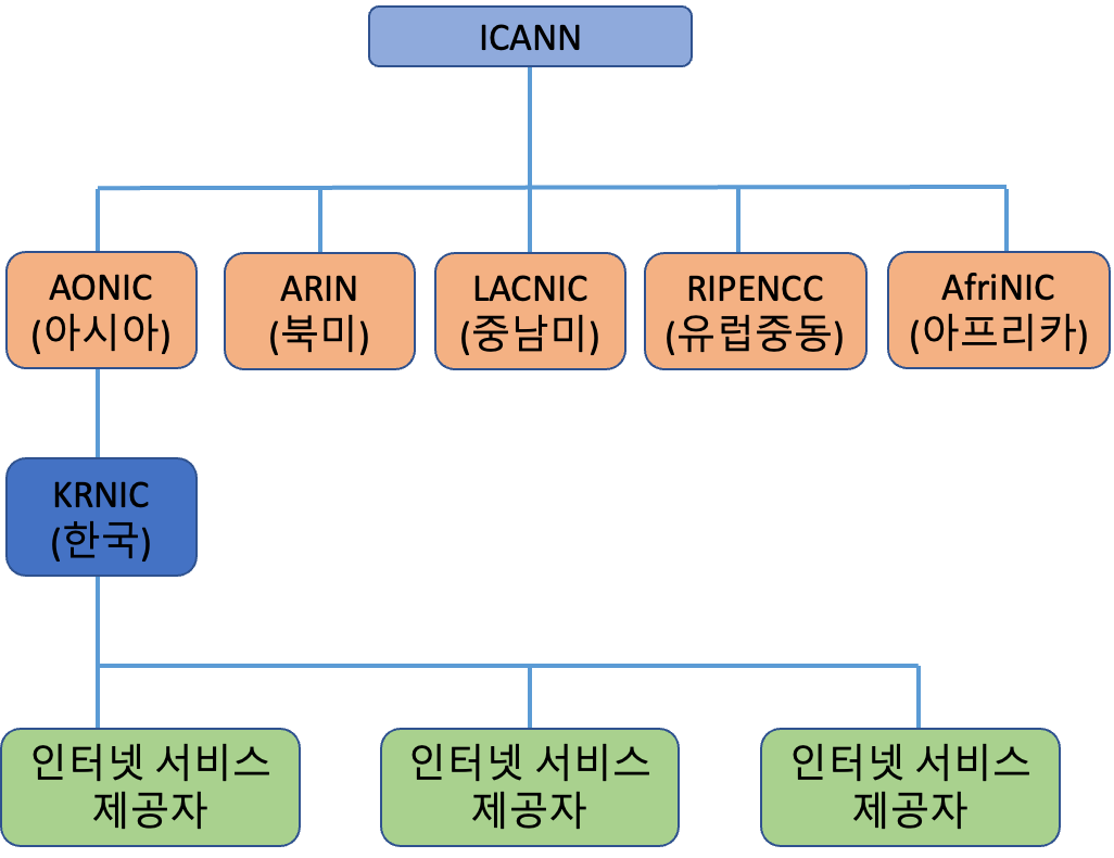퍼블릭 IP 어드레스 는 인터넷 안에서 중복되면 안 되기 때문에 ICANN(Internet Corporation for Assigned Names ans Numbers)이나 KRNIC(Korea Network Information Center)와 같은 단체가 관리하고 있어요. 때문에 퍼블릭 IP 어드레스가 필요하면 각 단체에 신청을 해서 할당 받으면 돼요. 이 퍼블릭 IP는 인터넷 레지스트리를 통해 인터넷 서비스 제공자들에게 할당되고 기업이나 가정은 인터넷 서비스 제공자가 확보한 IP 어드레스를 빌려 쓰면 돼요.
