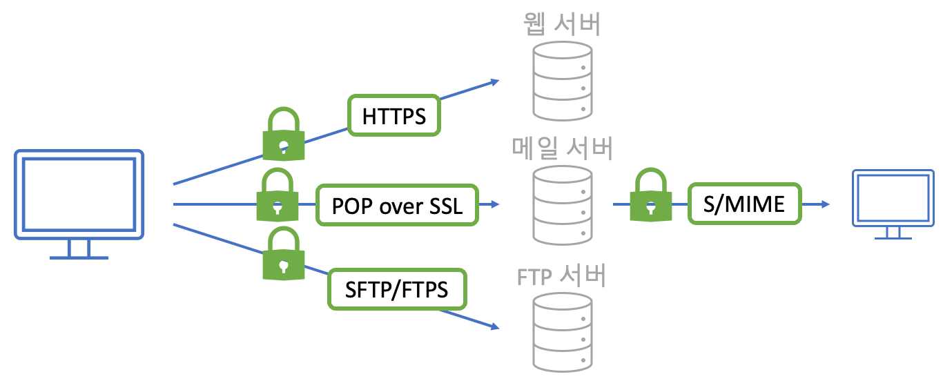 SSL(Secure Sockets Layer) 혹은 TLS(Tranport Layer Security) 는 클라이언트와 서버 간의 통신 보안을 높이기 위한 프로토콜이에요. 인증 기관에서 발행된 서버 인증서를 시용해 서버를 증명하고, 통신 구간을 암호화하여, 데이터 위변조를 막죠. 방법은 앞서 메일에서 사용한 방식인 S/MIME과 비슷해요. 다만 여기서는 서버와 클라이언트의 통신이기 때문에, 서버가 먼저 클라이언트에게 전자 인증서를 보내주죠. 그럼 클라이언트 측은 서버의 공개키와 난수를 사용해 생성된 공유 키를 이용하여 서버와 통신하죠. SSL/TLS를 사용안 보안 프로토콜 중 대표적인 것이 바로 HTTPS 에요.