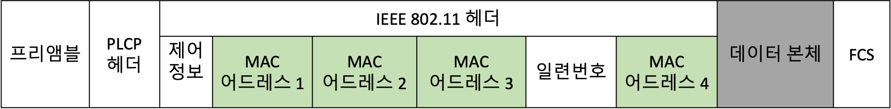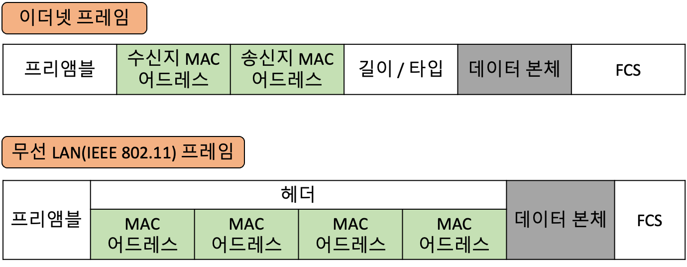 무선 LAN에서 통신할 때 주고받는 데이터도 프레임이라고 불러요. 유선과 다른 점이라면, MAC 어드레스 필드가 4개나 돼요. 이는 무선 LAN끼리 통신하는 경우나 무선 LAN 뒤에 유선 LAN이 연결되는 경우 등, 상황에 따라 MAC 어드레스에 할당되는 방식이 달라져요.