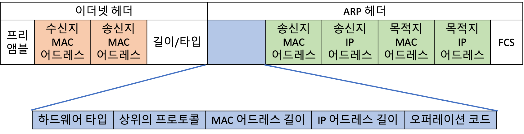 ARP 헤더에는 MAC 어드레스를 물어보는 송신지의 어드레스 정보와 MAC 어드레스를 알 수 없는 목적지의 어드레스를 담을 수 있어요. 오퍼레이션 코드가 1인 경우 요청을 의미하고, 2인 경우 응답을 의미해요.