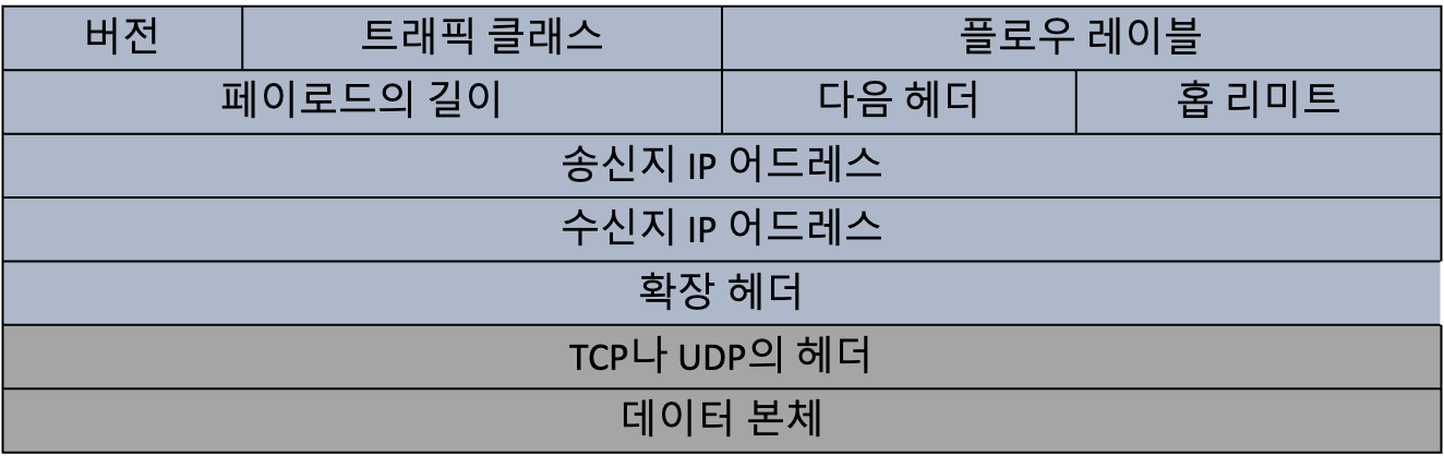 위의 헤더에서 트래픽 클래스, 페이로드 길이, 그리고 홉 리미트는 각각 패킷의 우선순위, 데이터 부분의 길이, 그리고 IPv4의 생존 기간과 같은 역할을 해요. IPv6는 라우터에서 데이터를 분할하지 않기 때문에, 분할 관련된 헤더 필드는 옵션으로 되어있어요. 이 옵션은 확장 헤더에서 지정할 수 있어요.