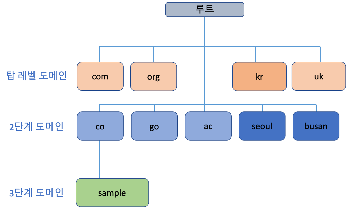도메인명은 계층 구조 형태를 마침표로 구분하여 표현해요. 가장 뒤에 오는 'com'이나 'org'와 같은 도메인이 상위 도메인이고, 최상위 도메인 혹은 탑 레벨 도메인이라고도 불러요. 그 밑의 도메인은 2단계 도메인 혹은 서브 도메인이라고 불리죠.