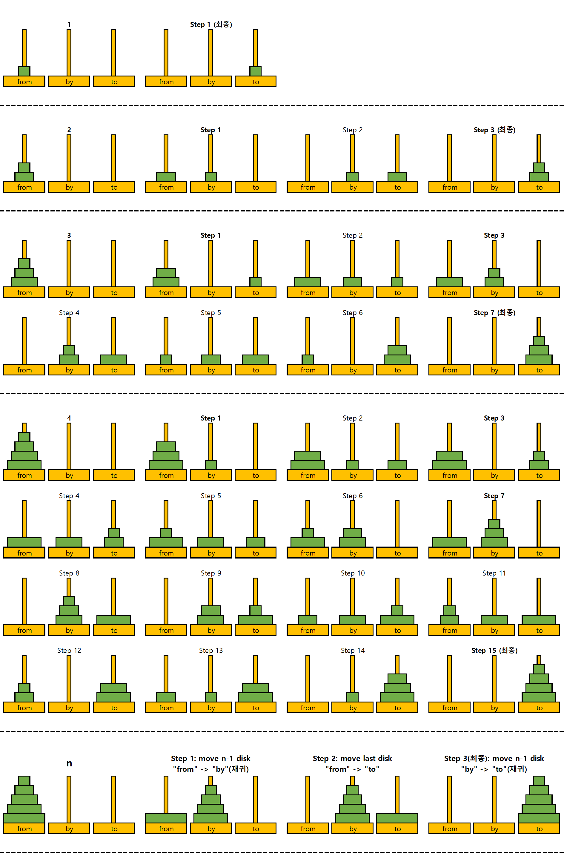 - step 1: move n-1 disk "from" --> "by" (재귀)