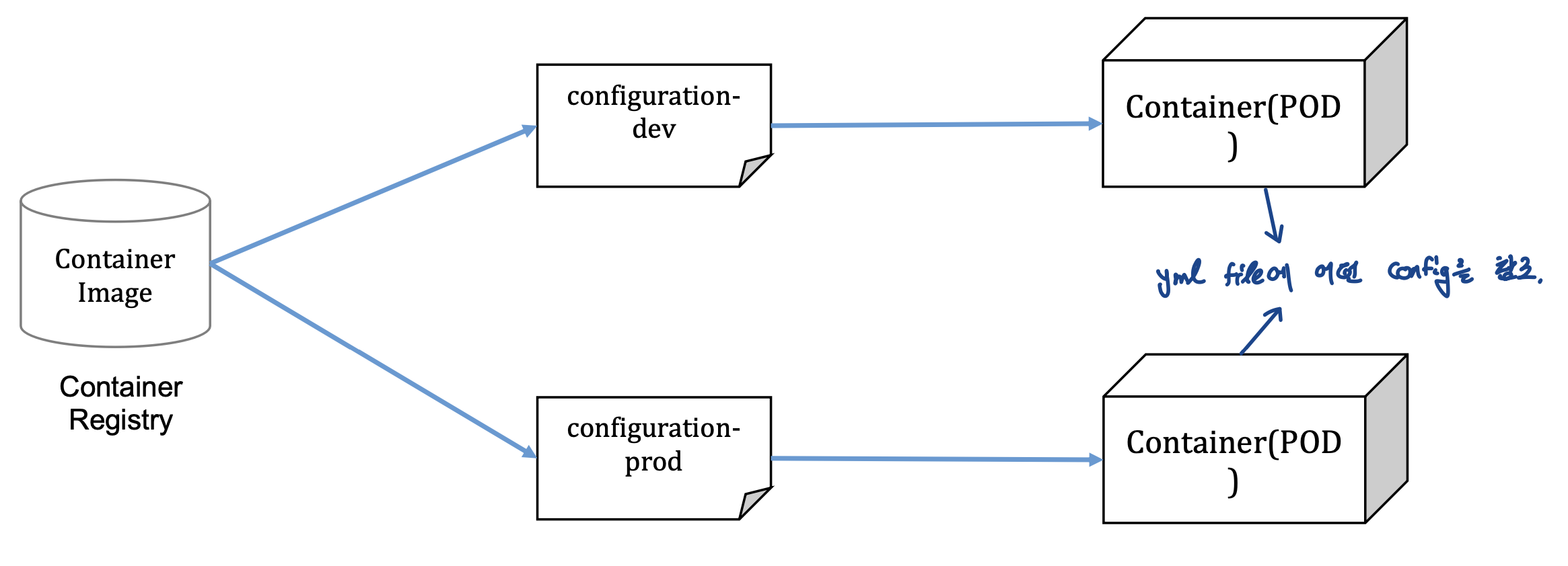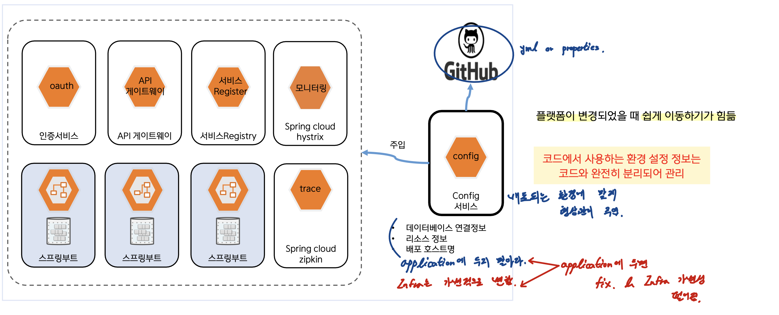 종속성을 없애기 위한 External Configuration 패턴 12 Factors -> 어떤 infra에 올라가더라도 최소한의 변경 (클라우드에서 돌아갈 애플리케이션은 하드웨어나 컨테이너 종속된 정보를 소유 X) 설정파일 변경에 따라 별도 빌드/배포 필요 없음 ConfigMap, Secrete