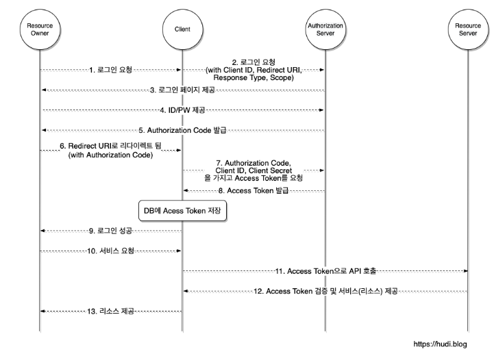 Client는 다시 Authorization Server에 Authorization Code를 전달하고, Access Token을 발급. Client는 자신이 발급 받은 Resource Owner의 Access Token을 DB에 저장.