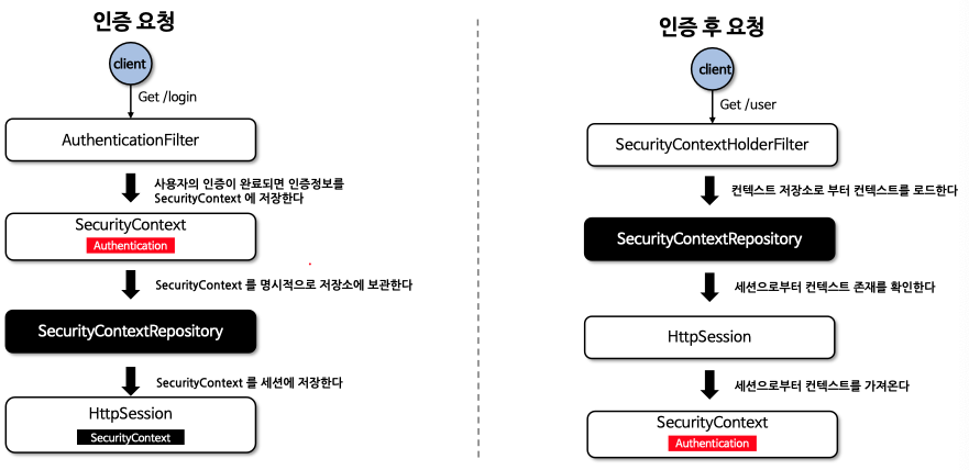 SecurityContextRepository를 사용 -> HttpSession에서 SecurityContext를 꺼내어 SecurityContextHolder에 저장, 다음 필터로 전달 / 세션으로 부터 꺼내와서 실행