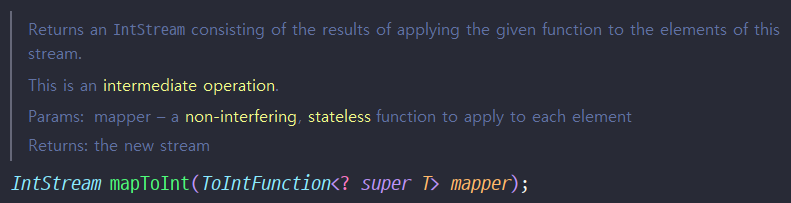 -> ToIntFunction이라는 인터페이스의 이름에서 알수 있듯, Function<T,R>에서 T만 제네렉, R은 int