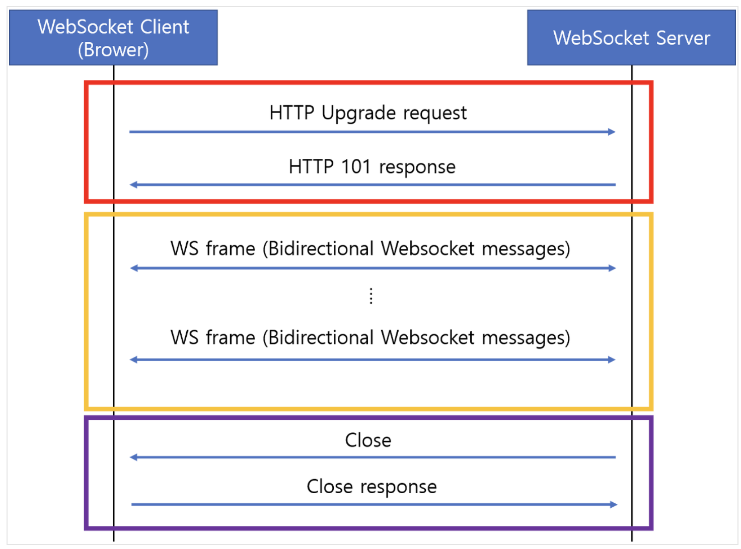 WebSocket 연결은 전이중 양방향 통신 사용. 즉 연결의 어느 한쪽이 원할 때마다 메시지를 보낼 수 있음