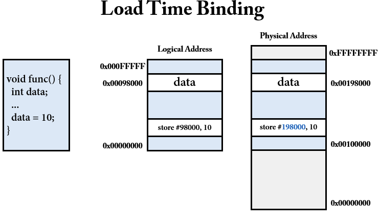 로딩할때 물리주소를 결정. 프로그램 내부에서 사용하는 주소랑 물리주소 다름