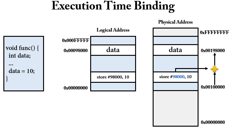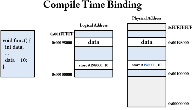 컴파일 시간 바인딩은 프로그램내부에서 사용하는 논리주소와 물리주소 동일