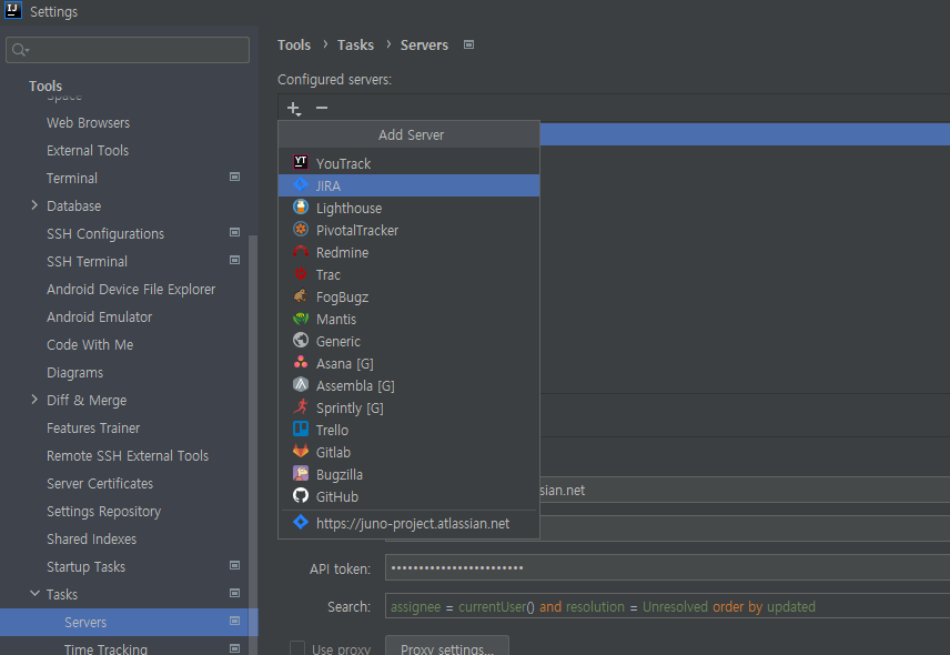 윈도우의 경우 Setting > Tasks > Servers에서 +버튼을 누르면 JIRA를 선택할 수 있게 된다.