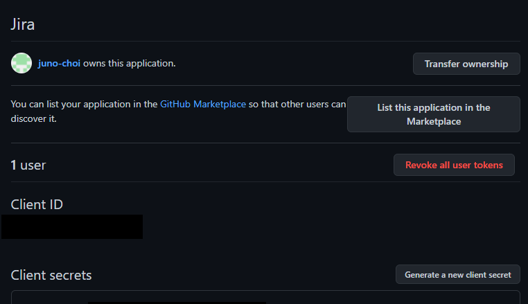 이렇게 생성을 완료하면 Client의 아이디를 확인할 수 있고 secret을 발급할 수 있다. 해당 키값은 단 한번만 보여주고 다시는 안보여주기 때문에 한번 눌렀을 때 꼭 복사해두자! 나는 카톡에 git token 으로 저장해두었다.