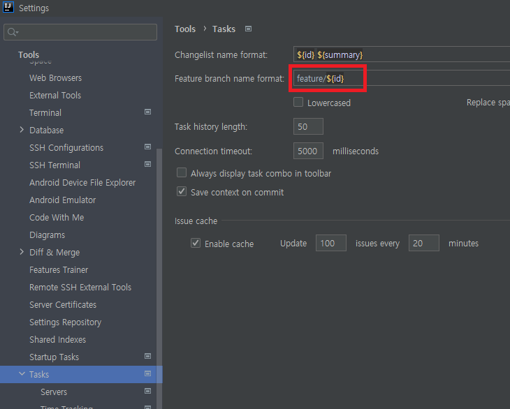 위와 같이 설정해준다면 생성되어질 때 자동으로 앞에 feature/ 가 붙어서 생성되어진다.