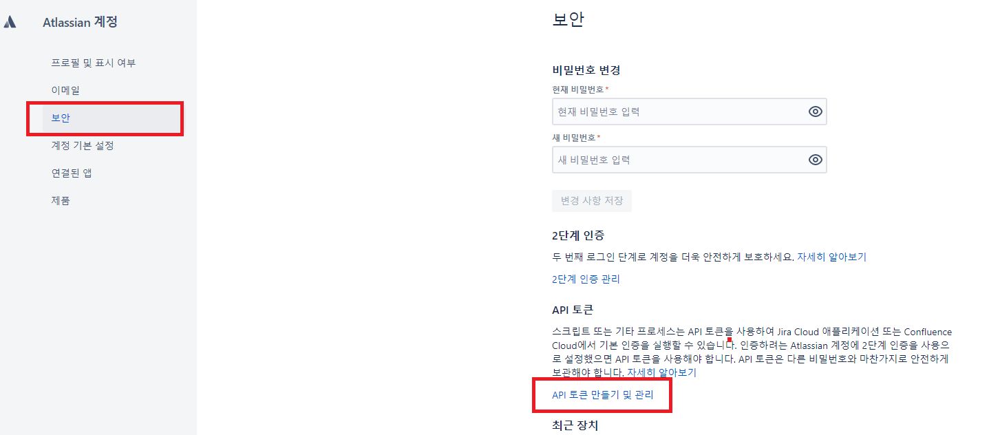 보안 > api 보안 토큰 발급받기 클릭 후 API 토큰 만들기 버튼을 클릭하면 토큰이 생성되어지는데 이 키값도 한번만 보여주므로 다른데 사용할 것을 생각하면 복사해두자!