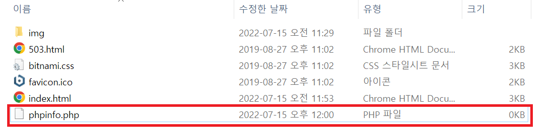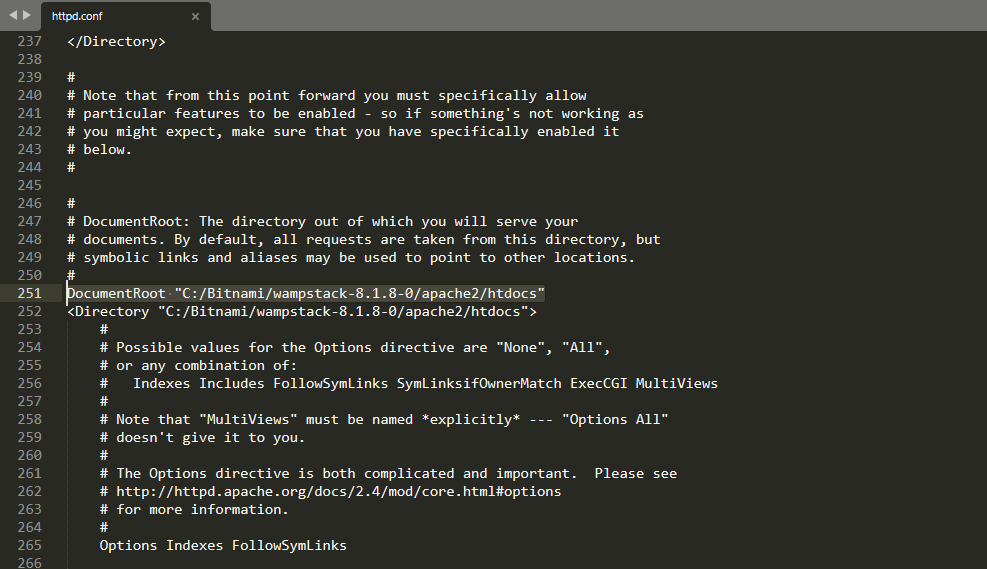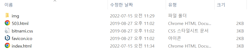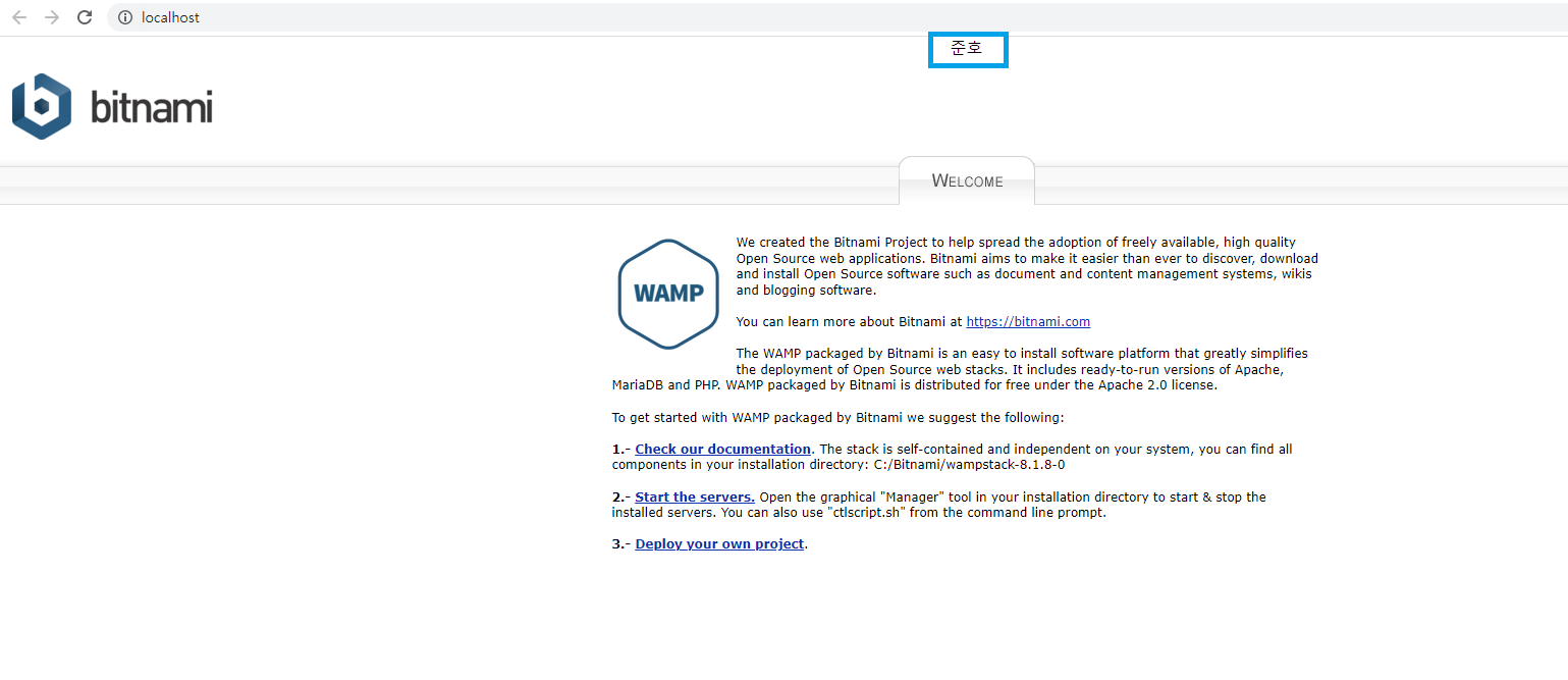 나의 경우 251 먼째 라인에 DocumentRoot로 apache에서 root 경로를 DocumentRoot "C:/Bitnami/wampstack-8.1.8-0/apache2/htdocs"로 정의해두었다. 그럼 해당 경로로 들어가보자.